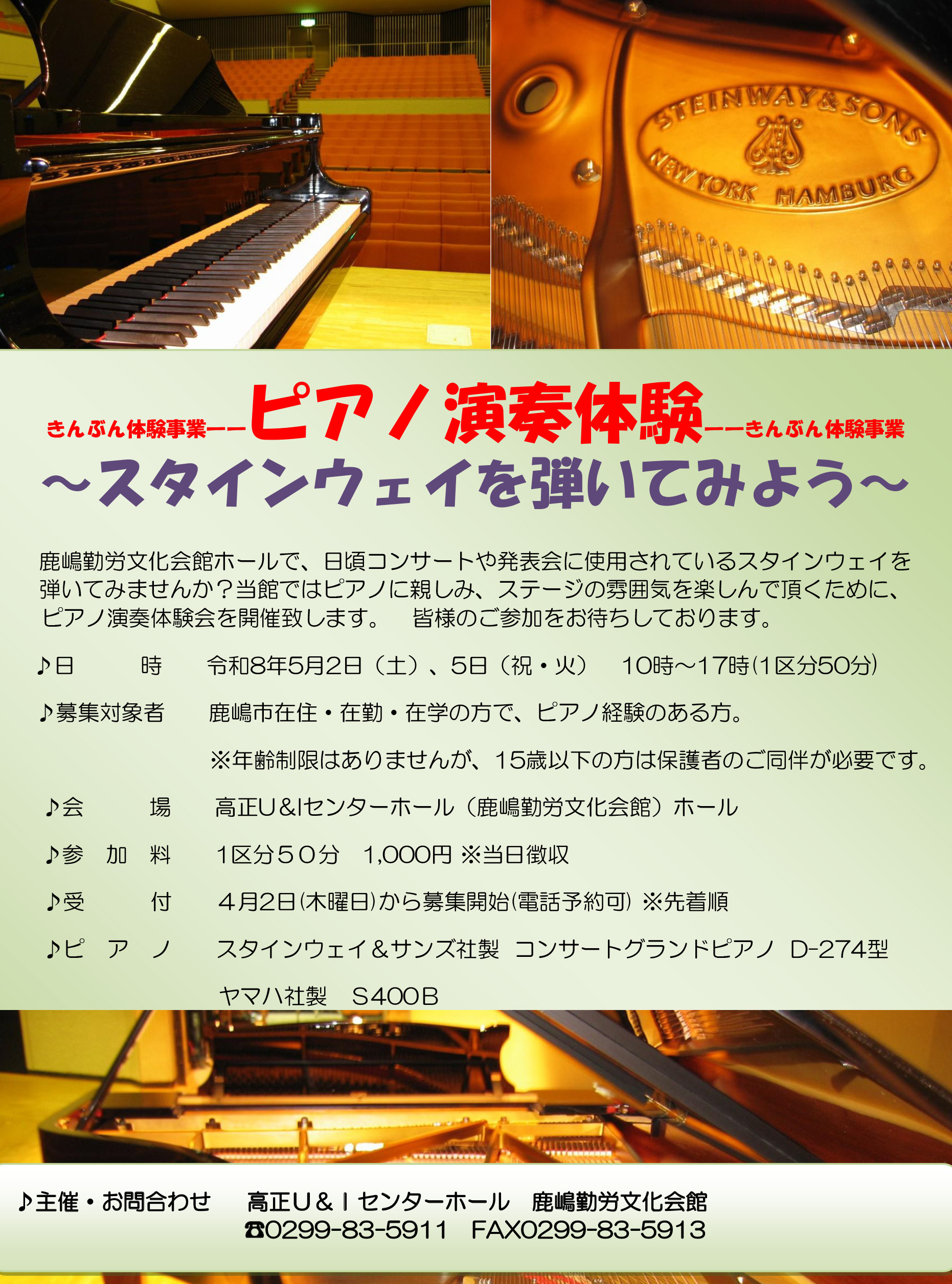 2026/03/29 高正U&Iセンターホールで日頃コンサートや発表会に使用されているスタインウェイを 弾いてみませんか?当館ではピアノを親しみ、ステージの雰囲気を楽しんでいただくため、 ピアノ演奏体験会を開催します。時間内ホールとスタインウェイを一人占めできる企画です。 スタインウェイD-274の他にヤマハS400Bもご準備いたしますので弾き比べや連弾も可能、 ホール貸し切りとなりますので、撮影や家族・友達を呼んでミニコンサートと言った使い方 もできます。皆様のご参加をお待ちしております。