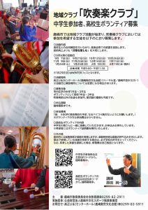 吹奏楽クラブ:高校生との合同練習を行いながら発表会等での披露を目指します。技術向上よりも「音楽を楽しむ」ことを大切にします。リハーサル室を中心に活動。活動日は、隔週日曜日9:00~11:30(変更の場合あり)。