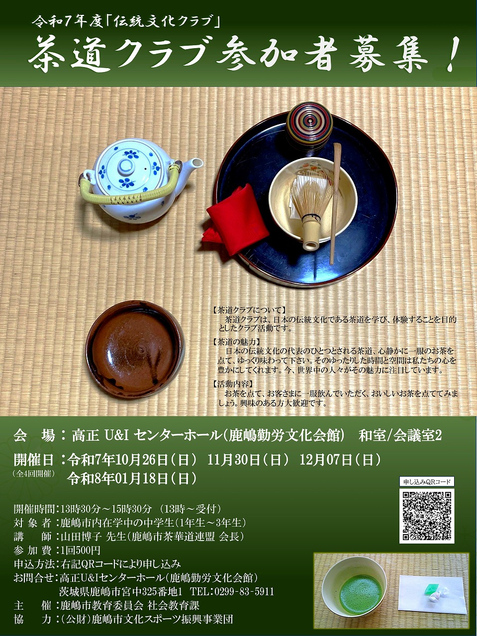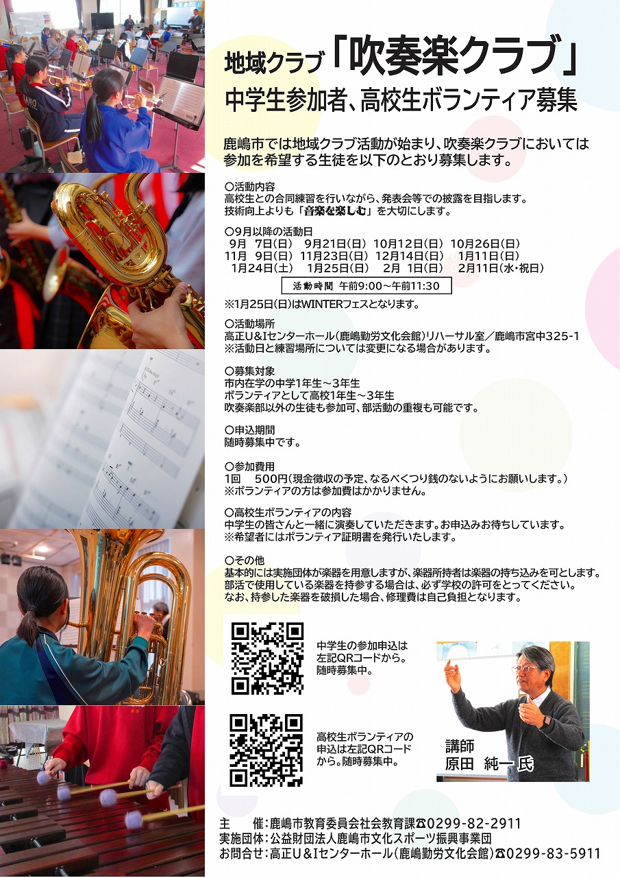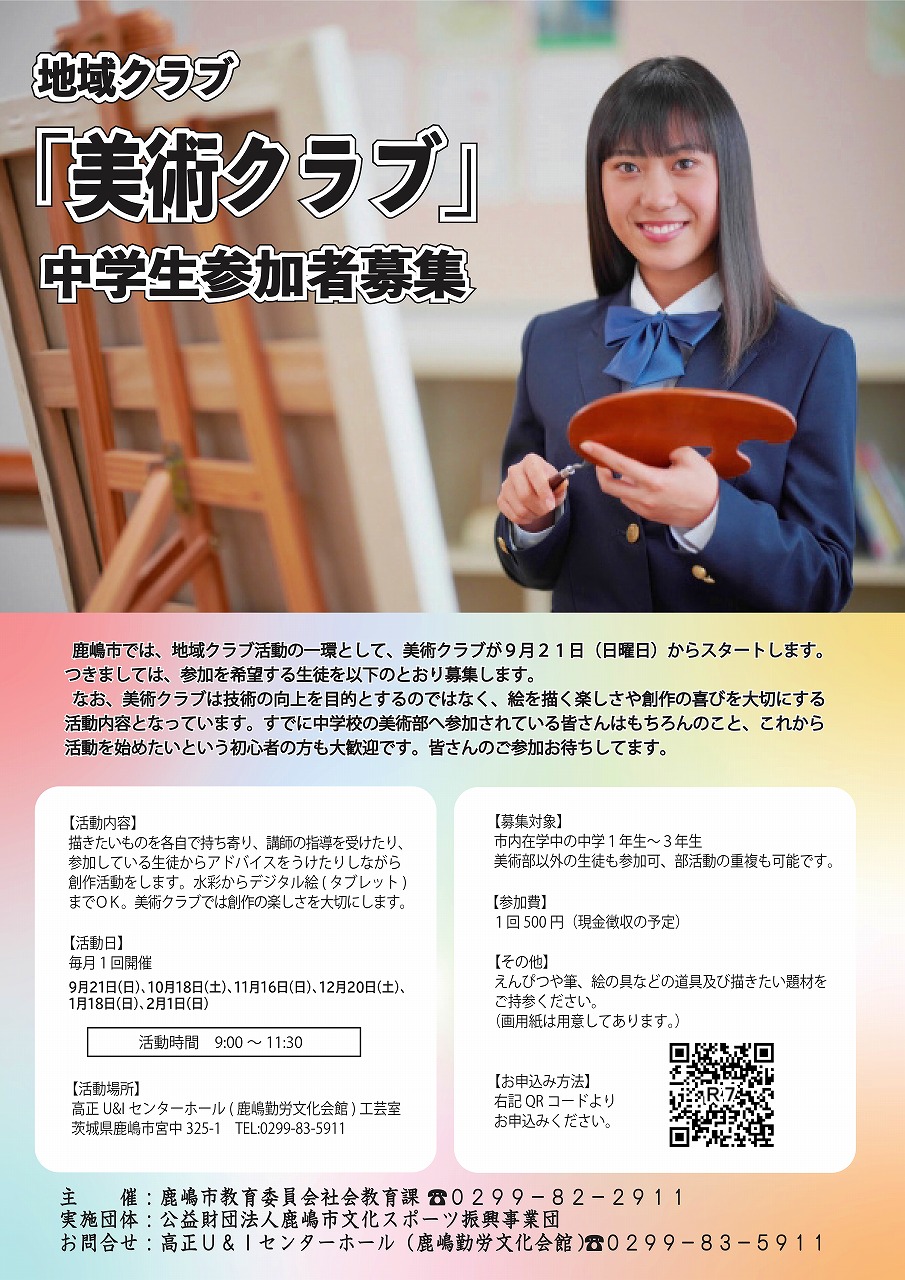 2025/09/26 鹿嶋市では、「生涯にわたってスポーツ・文化芸術活動を楽しむ環境を作る」をコンセプトに、子どもたちのための地域クラブ活動を推進しています。 高正U&Iセンターホール(鹿嶋勤労文化会館)では下記の地域クラブ活動(文化部)を行っておりますので、興味のある方は是非ご参加ください。