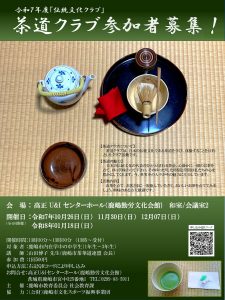 茶道クラブ:日本の伝統文化である茶道を学び体験することを目的としたクラブ活動です。国際的にも流行している茶道を体験してみては?和室/会議室2にて活動。活動日は毎月1回全4回13:30~15:30を予定。